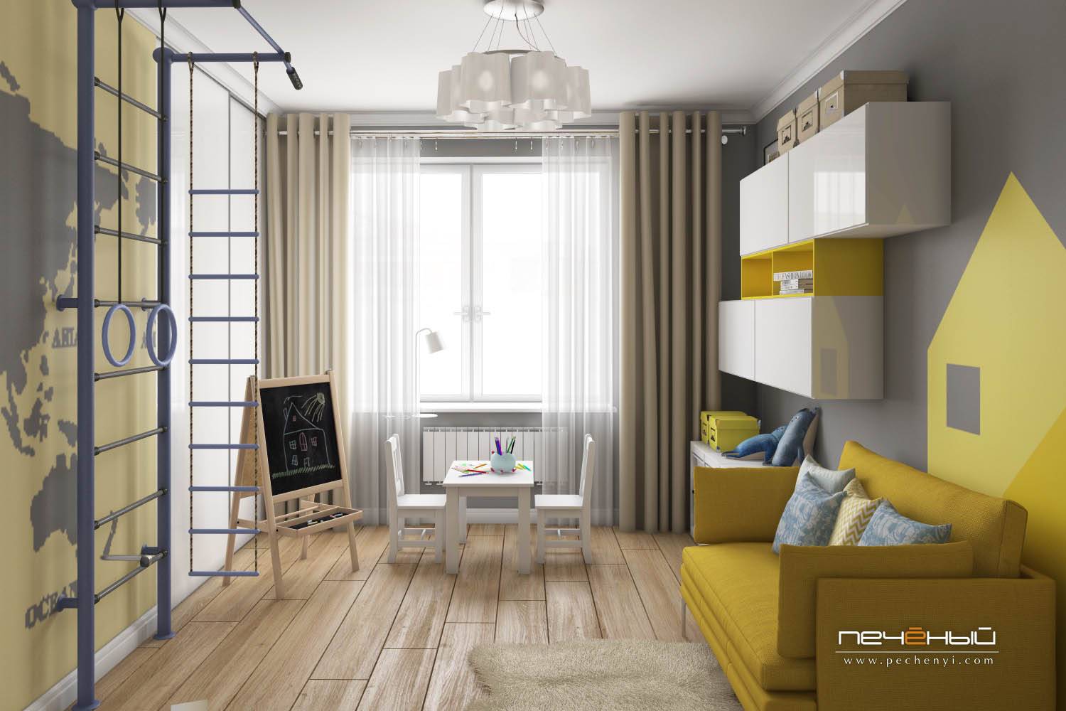 Часто, для поддержания спортивных интересов ребенка размещается шведская стенка или любой другой спортивный уголок. Шторы и тюль добавляют уют. Но, некоторые считают их “пылесборниками”. Для таких людей оптимальным вариантом станут рулонные шторы.