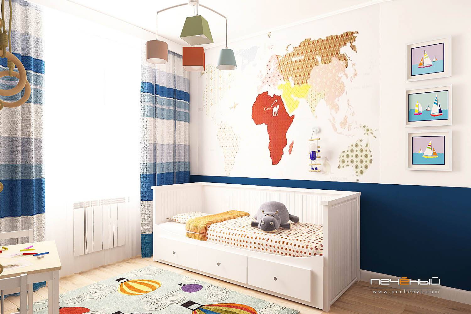 Особое настроение в детской создают детали. Красивое панно на стене с изображением сказочного замка, географическая карта, необычные часы не только вносят в интерьер разнообразие, но и помогают ребенку расширить кругозор, стать более дисциплинированным и проявить фантазию.