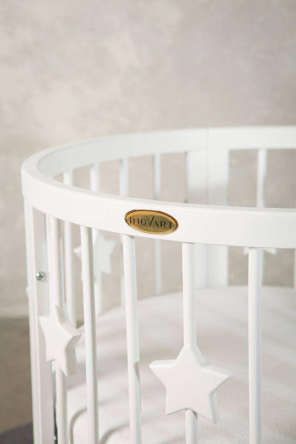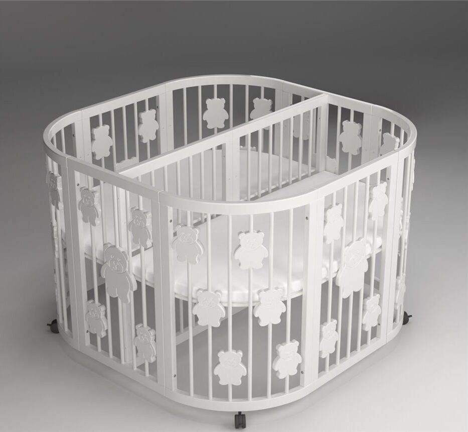 Меньше места займёт кроватка овальной формы. Отсутствие острых углов делает её более безопасной.