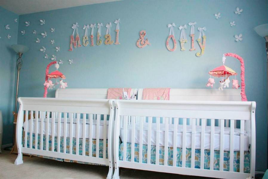 Красиво сделать детскую помогут мебель, рисунки на стене, на обоях – им будет приятно находиться в окружении сказочных образов. В качестве декора можно выложить большими буквами их имена или повесить интересное фотопанно, которое они смогут долго рассматривать, лежа в кроватке.