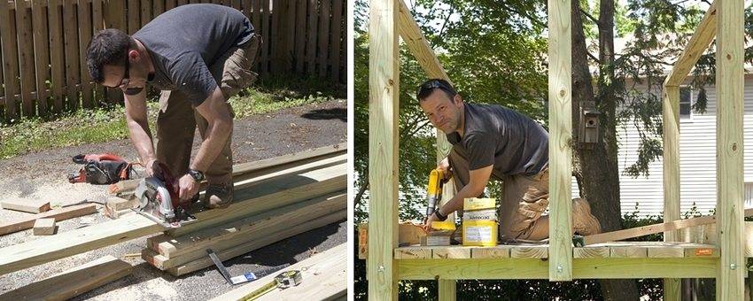 - под опоры выкапываются углубления примерно на 60 см. В них вставляются деревянные брусья, концы которых следует покрыть специальной гидроизоляционной мастикой. Это делается для того, чтобы продлить срок службы опор. В стойках вырезаются пазы, в которые вставляются соединяющие деревянные доски. Элементы полученной рамы соединяются между собой при помощи болтов или саморезов;