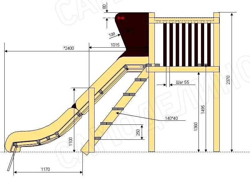 Не менее важным вопросом является подъем на горку. Лестницу необходимо оборудовать поручнями с обеих сторон. Дополнительные средства защиты также приветствуются: устойчивость и надежность. Так, при выборе дерева в качестве основного материала необходимо правильно подобрать крепежи – гайки, шайбы и болты. Направляющие спуска фиксируют на специальный клей – это обеспечит хорошее скольжение.