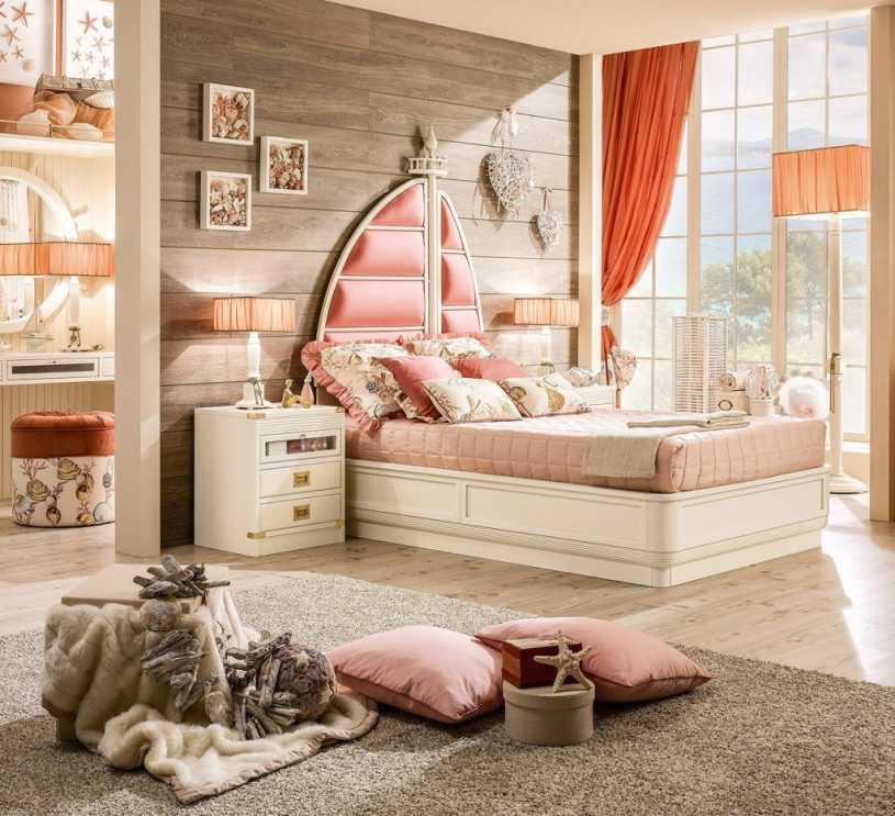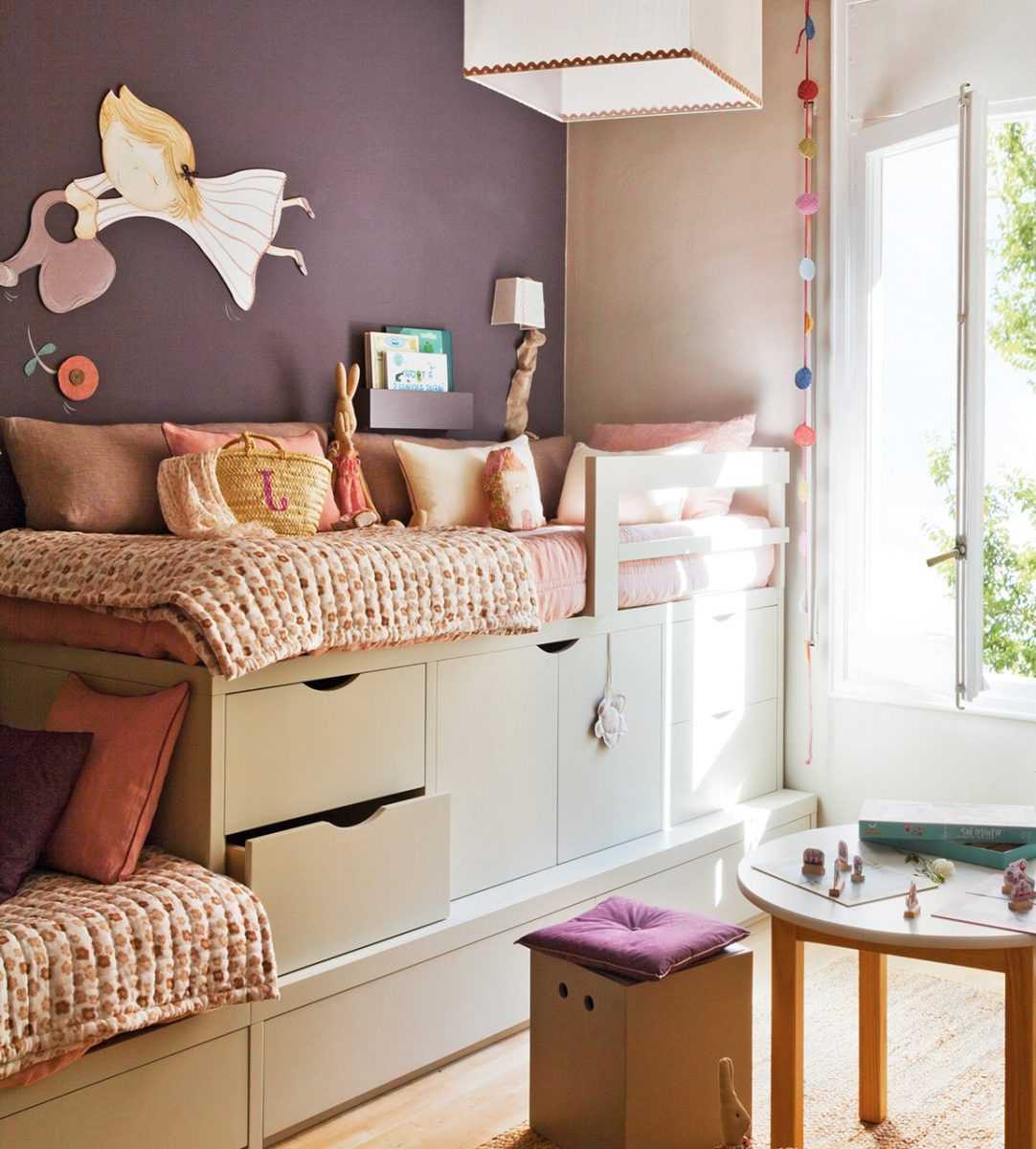 Кровать размещают в глубине помещения, там, где естественного освещения меньше. Лучше, если она будет отгорожена от остальной части комнаты. Спальня для девочки в этом случае будет отличаться от мальчуковой цветом и наличием декора, но некоторые моменты будут схожи: никаких острых углов и безопасные материалы.