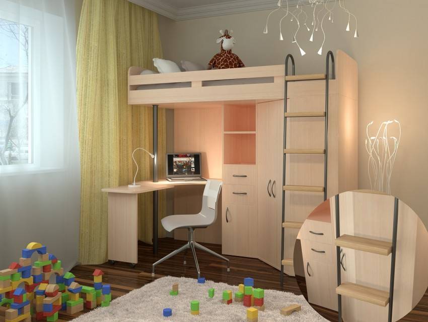 Детская кровать-чердак, расположенная в углу детской, занимает очень мало места, поэтому ее можно установить даже в самой маленькой комнате.