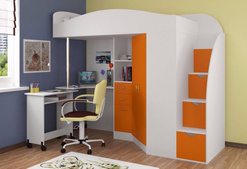Кровать чердак со шкафом или комодом позволит организовать отличную систему хранения детских вещей. Эта модификация подходит для размещения мебели в гостиной. Просторный встроенный шкаф могут использовать все члены семьи.