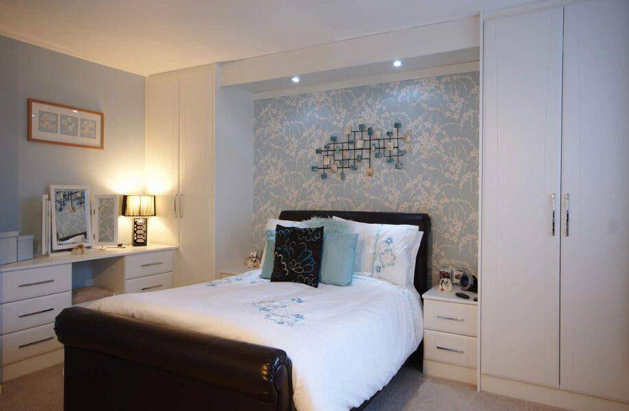 Дополнительно к навесному шкафу можно установить мебель и вокруг кровати. Спальня со шкафами по бокам кровати представляет один из типов современного дизайна комнаты.