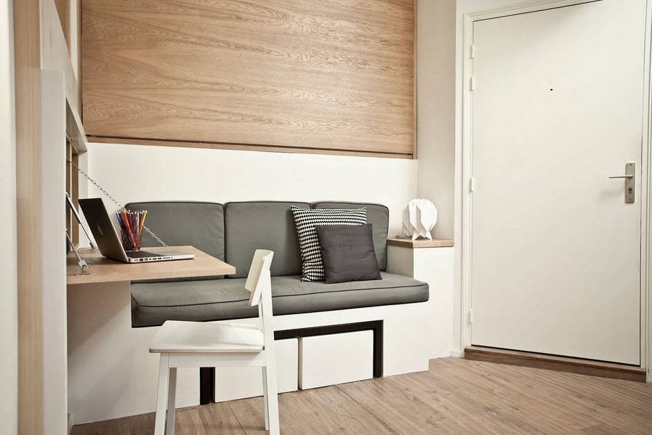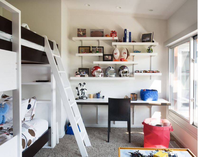 Еще одним интересным вариантом станет встроенный рабочий уголок для двоих детей. Его можно будет легко скрыть, закрыв двери