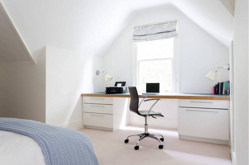 Рабочее освещение. Для того, чтобы обеспечить комфорт при мелкой работе, письме, чтении, можно использовать классику: настольную лампу. Лучше всего выбрать устройство с многоступенчатым шарнирным кронштейном, который позволит разворачивать абажур под тем углом и на такое расстояние, как это требуется в конкретный момент. При размещении рядом со столом шкафов основание лампы можно прикрепить к боковым стенкам.