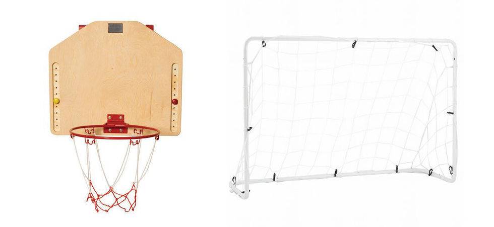 Если детям позволено играть дома с мячом, то баскетбольное кольцо (мы нашли вот такое минималистичное с метками для ведения счета за 24 $) или маленькие футбольные ворота смогут разнообразить игры и помогут развить координацию.