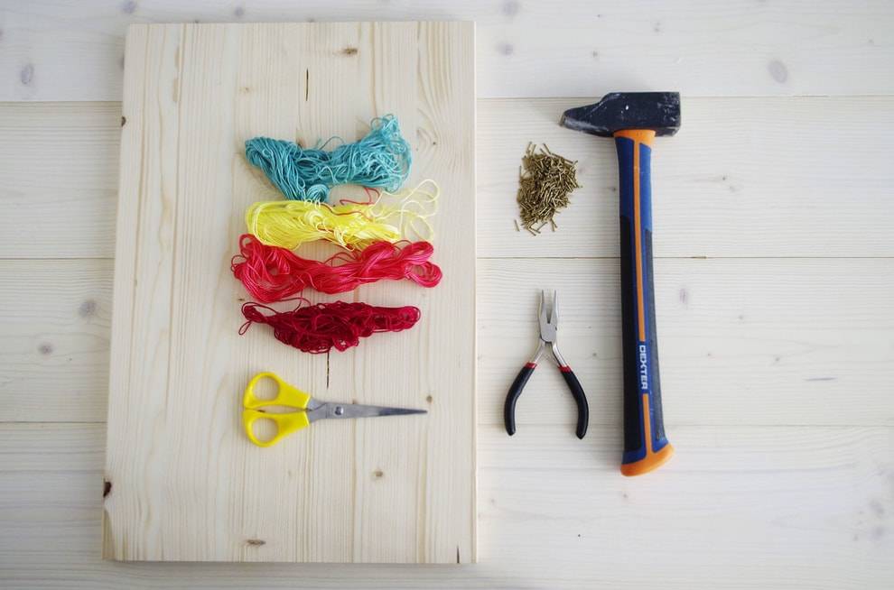 Кладем листок с именем на деревянную доску. Фиксируем гвоздь на крае буквы и забиваем его молотком. Поочередно вбиваем остальные гвозди на равном расстоянии.