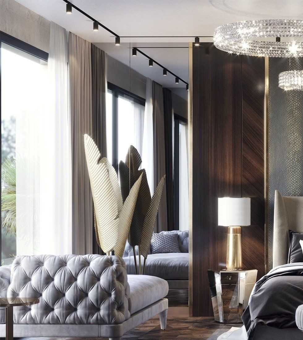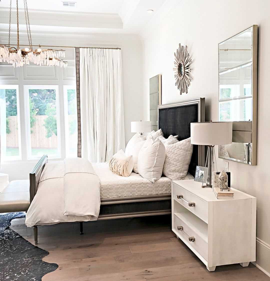 Позаботьтесь о многоуровневом освещении. Бесспорно, достойным решением будет красивая люстра в спальне. Однако степень освещенности регулируется при необходимости. И наличие приглушенного света не навредит.