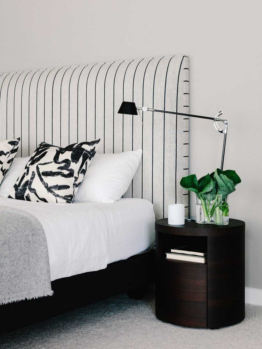 - Спальня в бело-чёрных тонах вызовет восхищение у гостей, если у кровати будет располагаться красивый дорогой торшер.