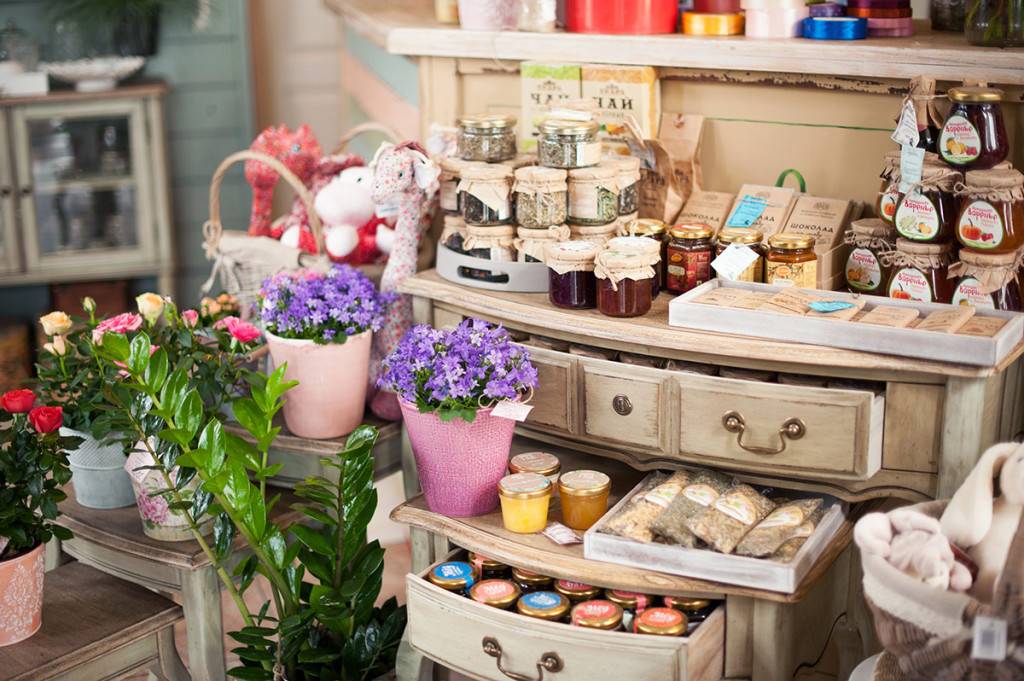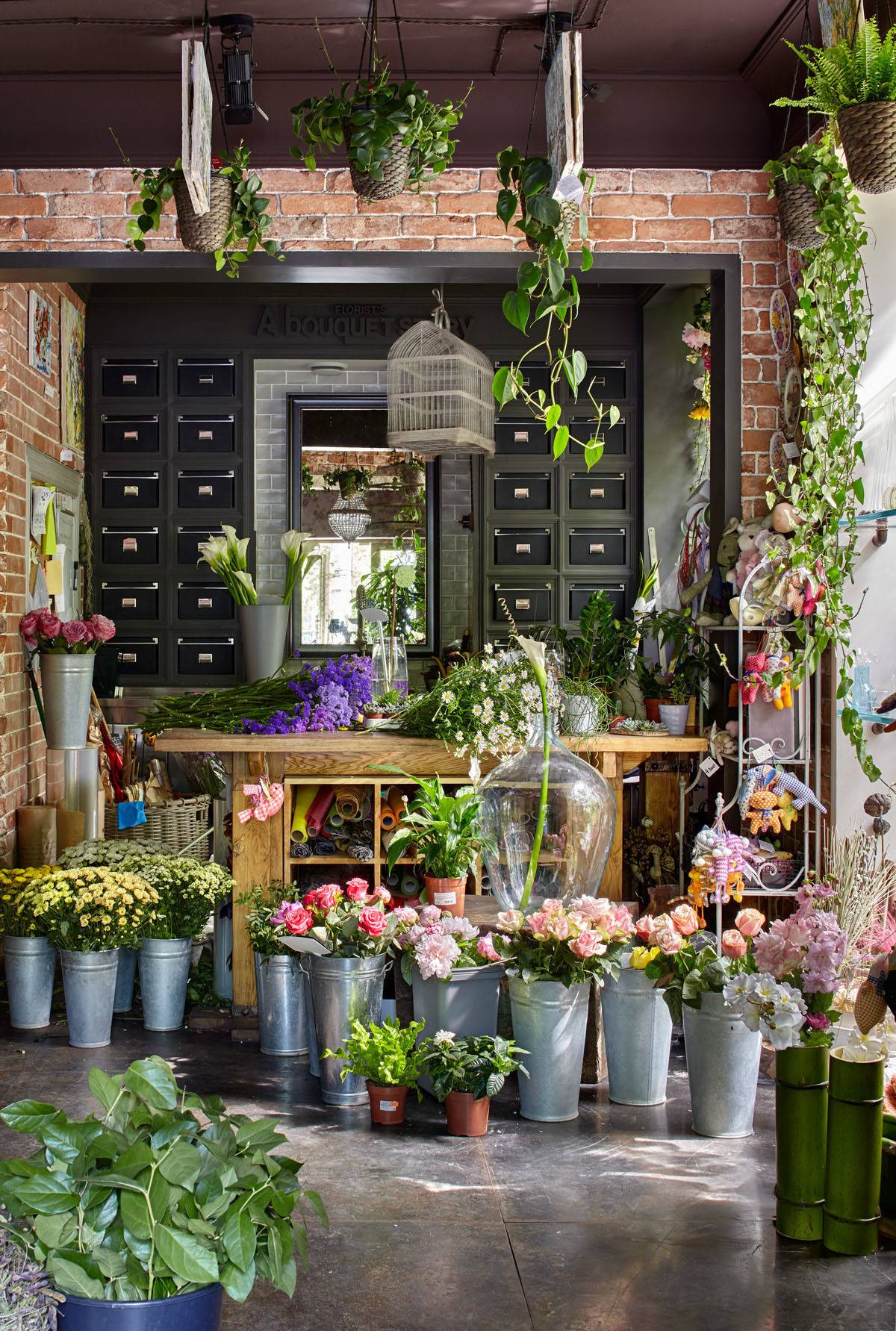 Если предполагается большой поток покупателей, наиболее выгодно смотрится оформление магазина цветов в эклектичном стиле.
