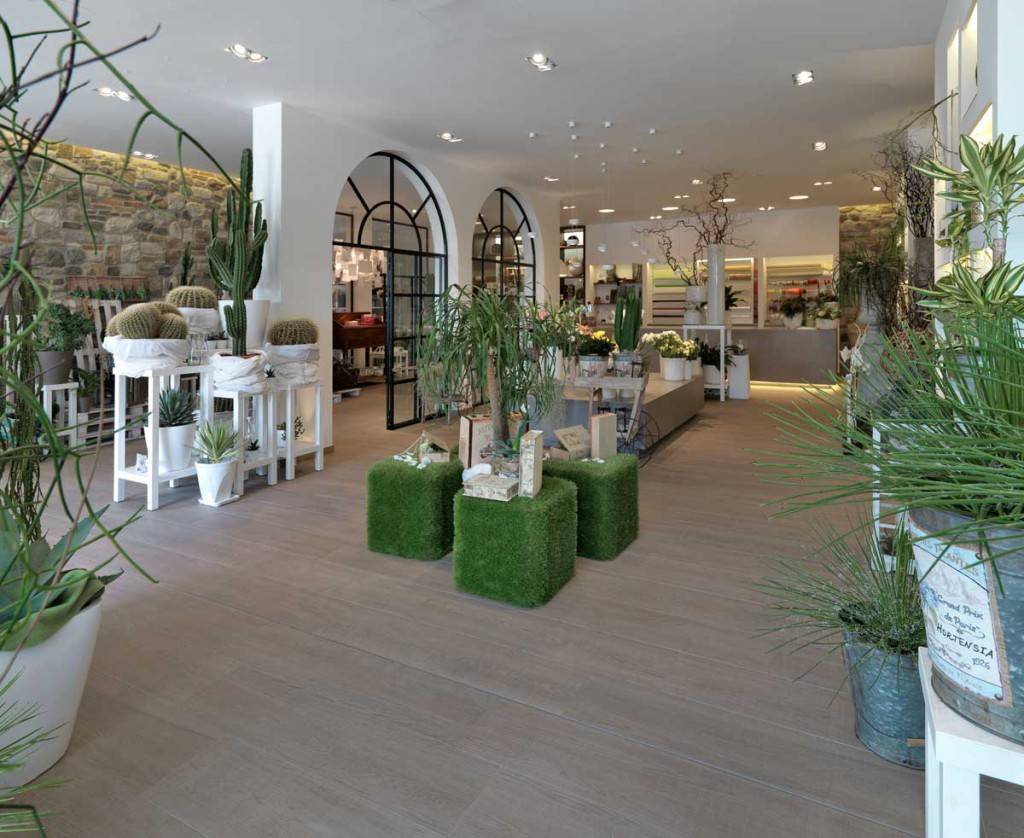 Интерьер цветочного магазина, который Вы видите на фото, создавался так, чтобы отделка хорошо подходила под живую флору. Не придумывайте ничего нового, так как природа все сделала уже за нас. Осмотритесь вокруг, и заметите, что цветы хорошо смотрятся на фоне гор и деревьев. Это значит, что по аналогии с природой оформить магазин внутри помещения можно деревом и камнем.