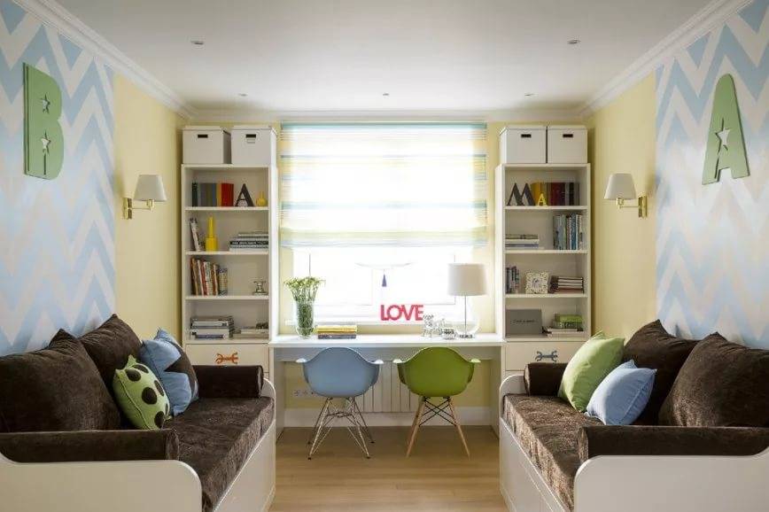 Комната для двоих однополых детей оформляется в одной оттеночной гамме, которая приходится по вкусу обоим хозяевам спальни. Оптимальной планировкой является расположение двухъярусной кровати возле одной стенки, обустройство рабочего места и систем хранения вдоль противоположной или смежной стены. В детской также можно снизить уровень подоконника, расширить его и превратить в небольшой диванчик для чтения или игр.