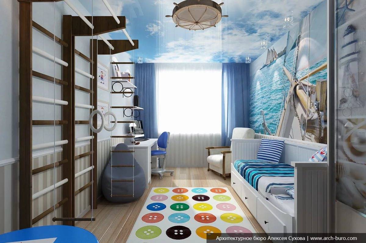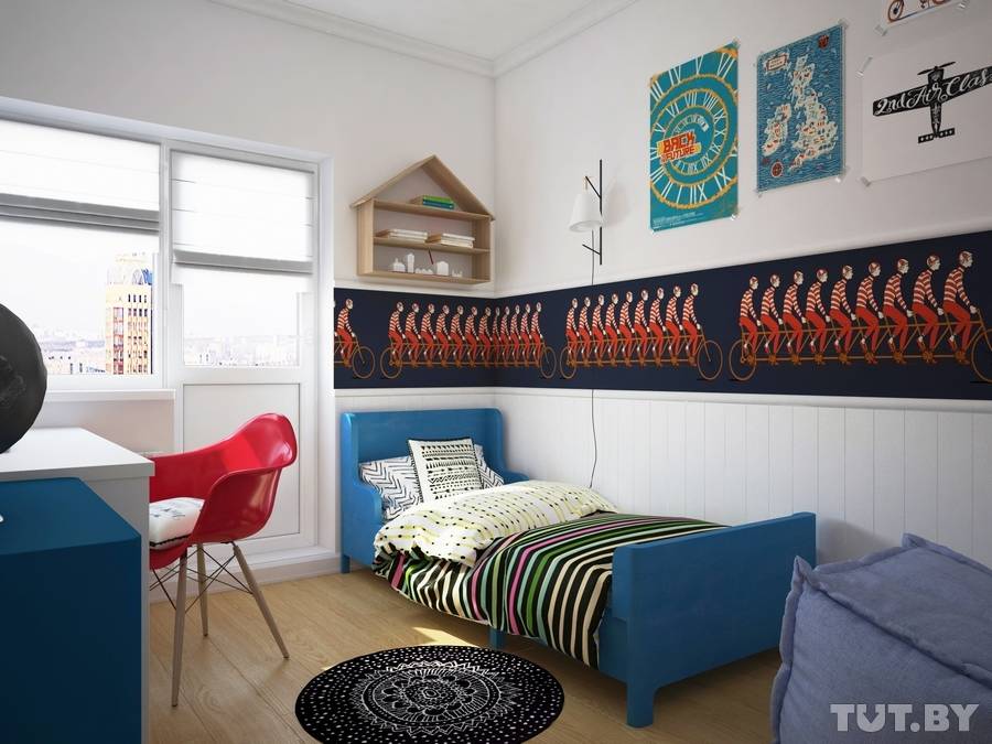Планируя комнату мальчика, лучше отдать предпочтение оттенкам синего, зеленого. Обставить интерьер нужно с учетом его интересов: машинки, самолеты, роботы, спортивные принадлежности и т. д.