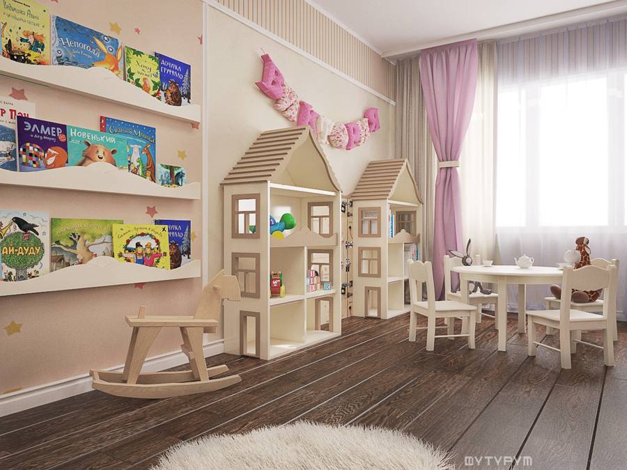Для корректного обустройства игровой комнаты рекомендуется сразу составить проект. В него должны входить зоны для игр (и при необходимости спортивных занятий), отдыха, чтения. Организовать пространство для рисования и общения со сверстниками, как в частном саду, поможет установка детской мебели. К примеру, это может быть комплект из стола и стульев от Икеи. Для малышей в возрасте 1 года или чуть старше рекомендуется установить дополнительно игровой столик с сортером. Детям от 3 лет будет интересно играть с сюжетно-ролевыми наборами. В таком случае взрослым следует отдельно установить игрушечную школу или больницу для животных, торговый центр (домик) с игрушками.