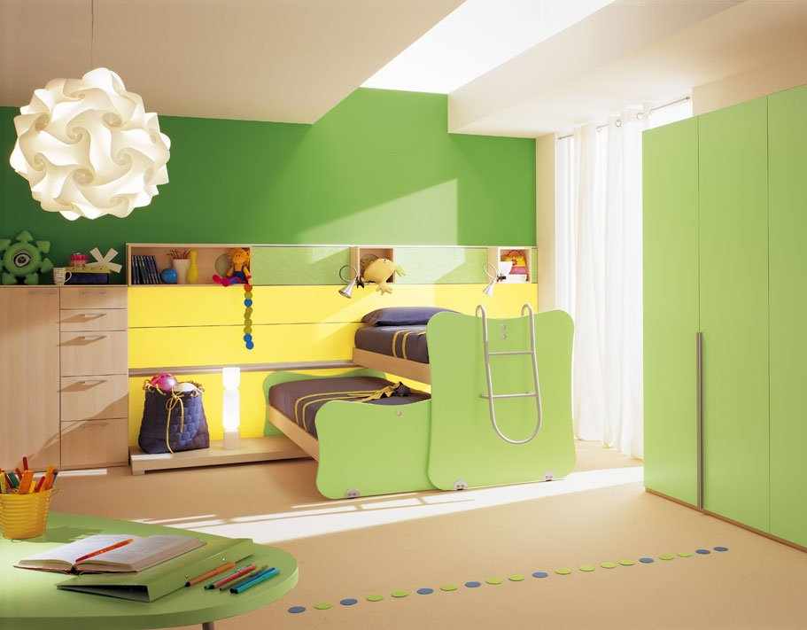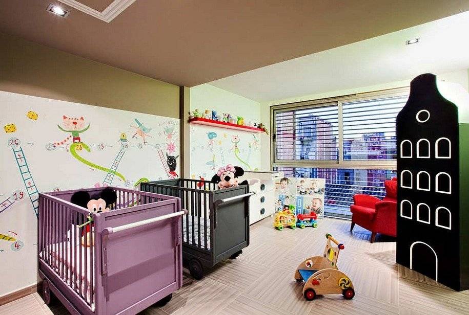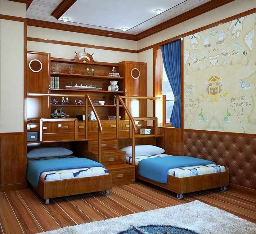 Подобный интерьер в основном отличается наличием игровой и спальной зоны с двумя кроватями. При дефиците площади, будут уместны выкатные кровати. Не желательно устанавливать двухэтажные модели, так как ребенок может упасть или травмироваться.