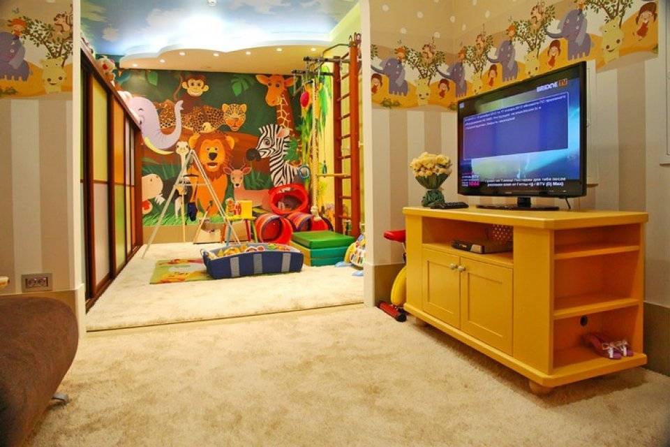 Игровая часть помещения — самая любимая. Если идея обустройства зоны развлечений пока не приходит в голову, вспомните детские садики. Когда квадратные метры слишком не сковывают, можно попробовать организовать место для активных и подвижных игр, установить детский спортивный комплекс, шведскую стенку. Собственные уголки для сюжетных игр, маленькие домики, палатки с неописуемым восторгом воспринимаются детьми, позволяют уединиться, почувствовать себя хозяином собственного вымышленного мира.