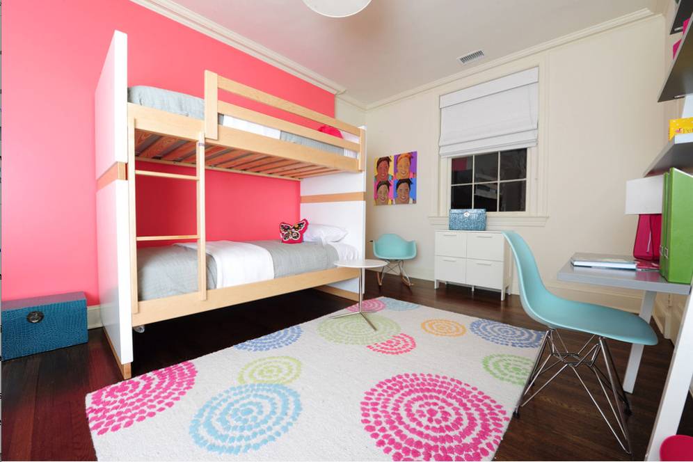 Спальня для двух девочек должна быть также идеально продумана до мелочей. Дети должны быть размещены максимально удобно, при этом необходимо знать, что с возрастом девочки неохотно делят свое пространство с кем-то, в отличие от мальчиков. Поэтому стоит заранее позаботиться о достаточном разделении пространства между детьми.