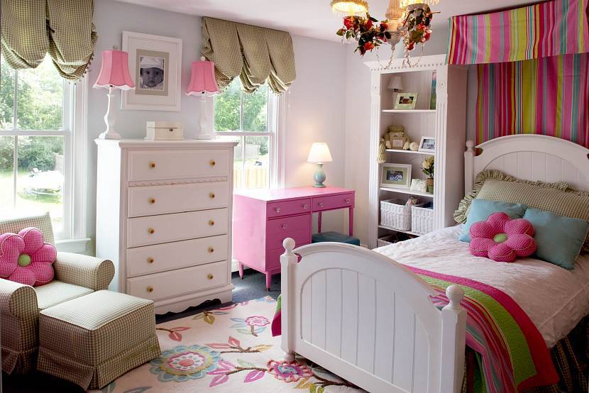 Вместо спортивного уголка в игровой зоне может появиться небольшой раскладной диванчик с яркой обивкой с ворохом подушек, одетых в разные наволочки. Маленьким кокеткам нужно следить за своей красотой, поэтому в их комнате обязательно должен появиться туалетный столик и зеркало с правильно организованной подсветкой.