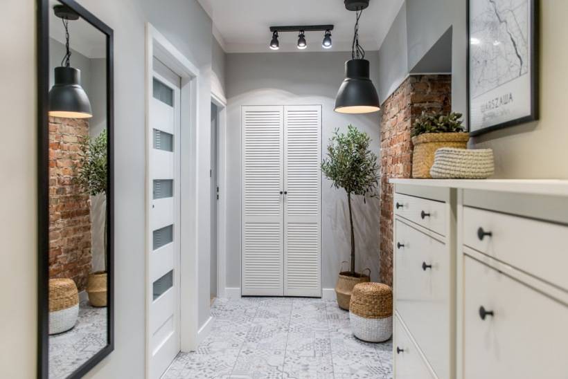 В небольших помещениях мягкий теплый свет вряд ли подойдет. Излишек украшений — корзин или ящиков — уменьшает такой интерьер. Стильная мебель, небольшие шкафы с выдвижными ящиками или поворотные модели и встроенные шкафы-купе — эффективное решение. В большой прихожей вы можете разместить книжный шкаф с любимыми книгами. Одинарные лампы, которые выглядят модно и современно, также являются отличной идеей.