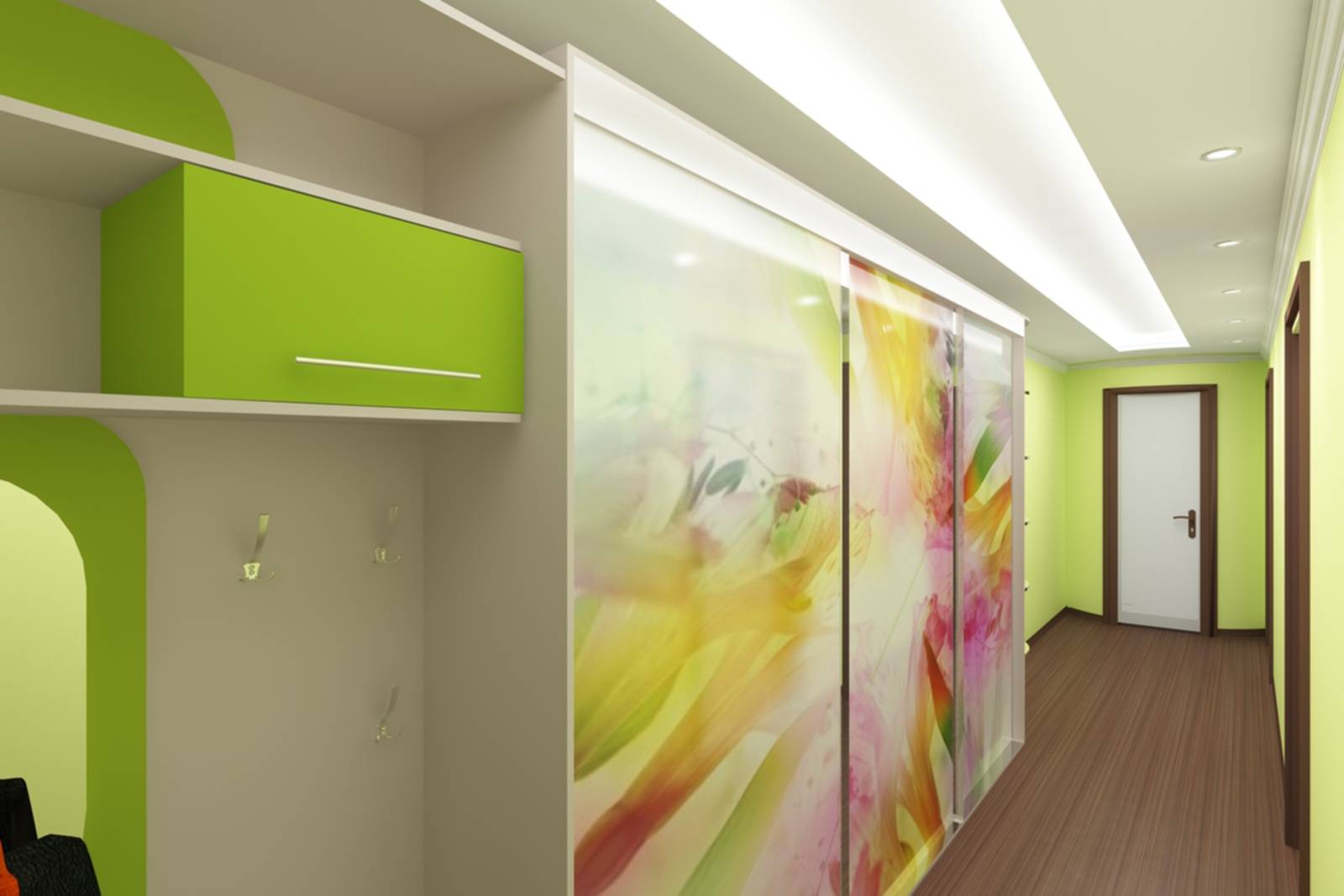 Потолок узкого и длинного коридора лучше оформить цветами на пару тонов светлее стен прихожей. Для узкого коридора (фото дизайна отлично это демонстрирует) желательно уменьшить высоту потолка с помощью натяжных или подвесных конструкций
