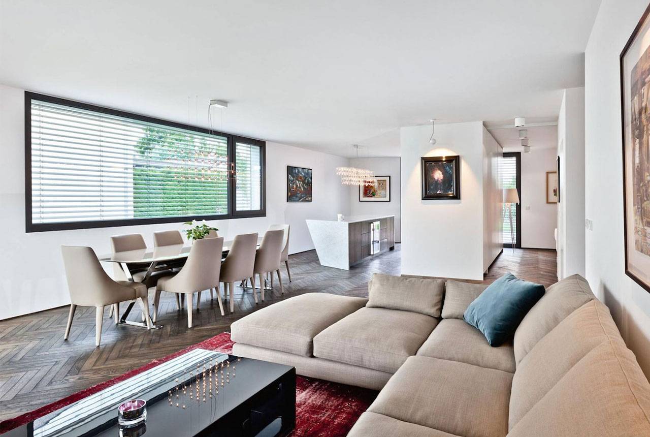 В идеальном случае кухня с гостиной должны быть расположены на одной оси с выходом на террасу. Столовая должна быть между гостиной и кухней. Это естественный буфер между комнатами, разделенными вымышленными барьерами.