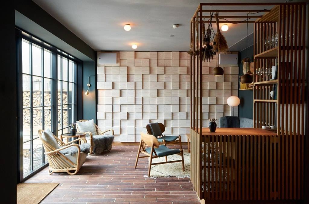 - Цвета. Пример: черная стена за креслом и светло-серая в обеденной зоне.