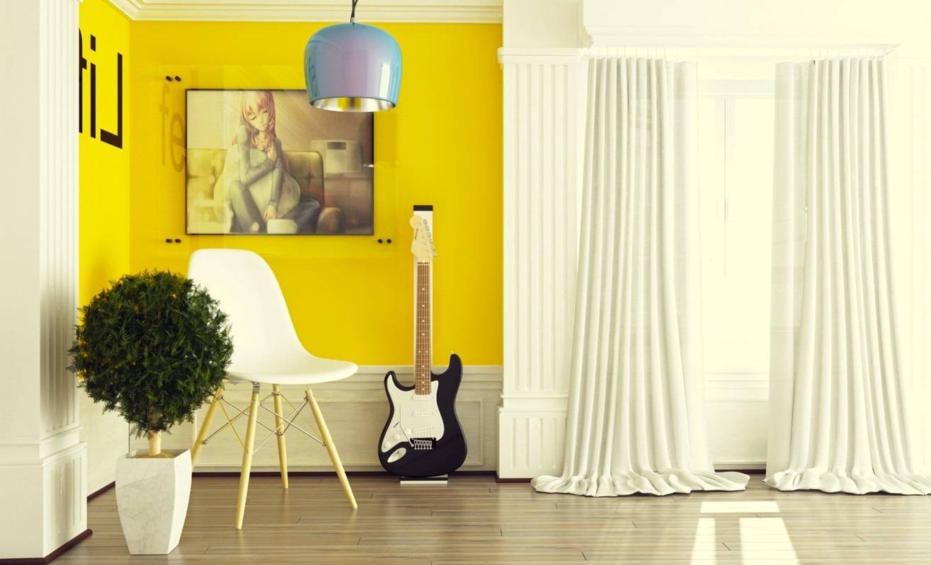 Белая отделка в соединении с насыщенно-желтыми декорациями будут смотреться интересно и привлекательно в гостевой комнате. Особенно интересно будет выглядеть мягкая мебель в таком цвете. При такой стилистике помещение будет выглядеть не только уютно, но еще креативно и современно.