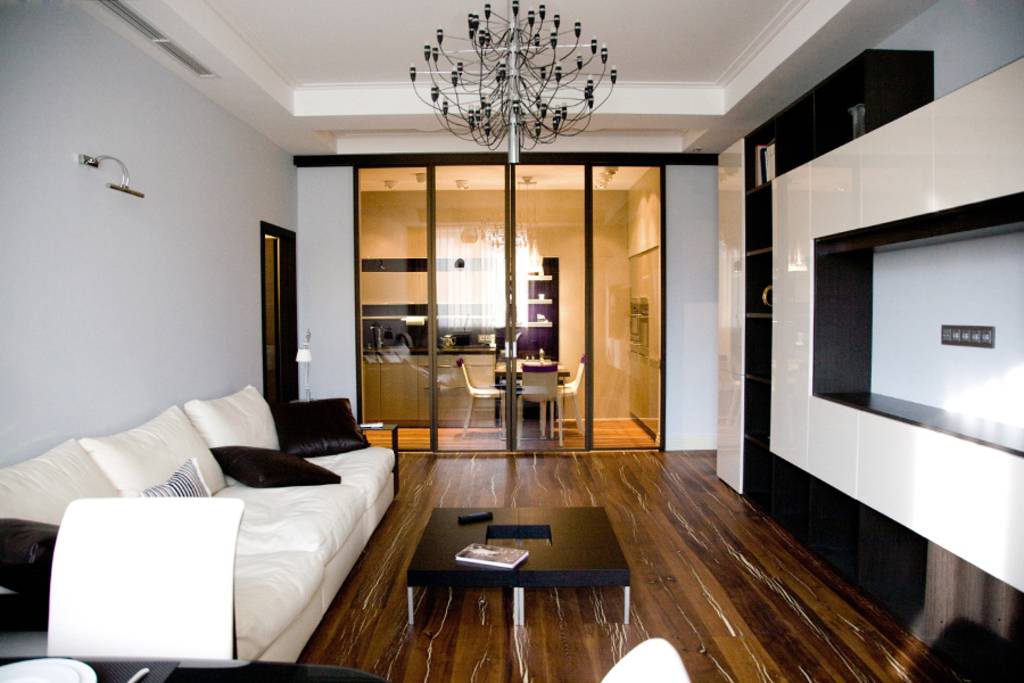 Важный нюанс: люстра, одиноко висящая посередине совмещенного пространства – это не просто плохая идея, а, как говорил классик, предание старины глубокой! Если вам нравится верхний свет, то расположите две люстры посередине потолка каждой зоны. Этот вариант будет более подходящим.