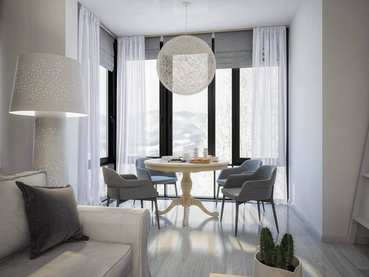 - Скандинавский стиль идеален для малогабариток. Это свежий, легкий, минималистский стиль с обилием светлых оттенков. Белые стены и потолок визуально помогут увеличить границы комнаты. Если оставить окно без штор, как это часто делают в скандинавских странах, естественного света станет больше. Характера интерьеру можно придать с помощью необычных деталей: например, светильников или текстиля с интересными принтом.