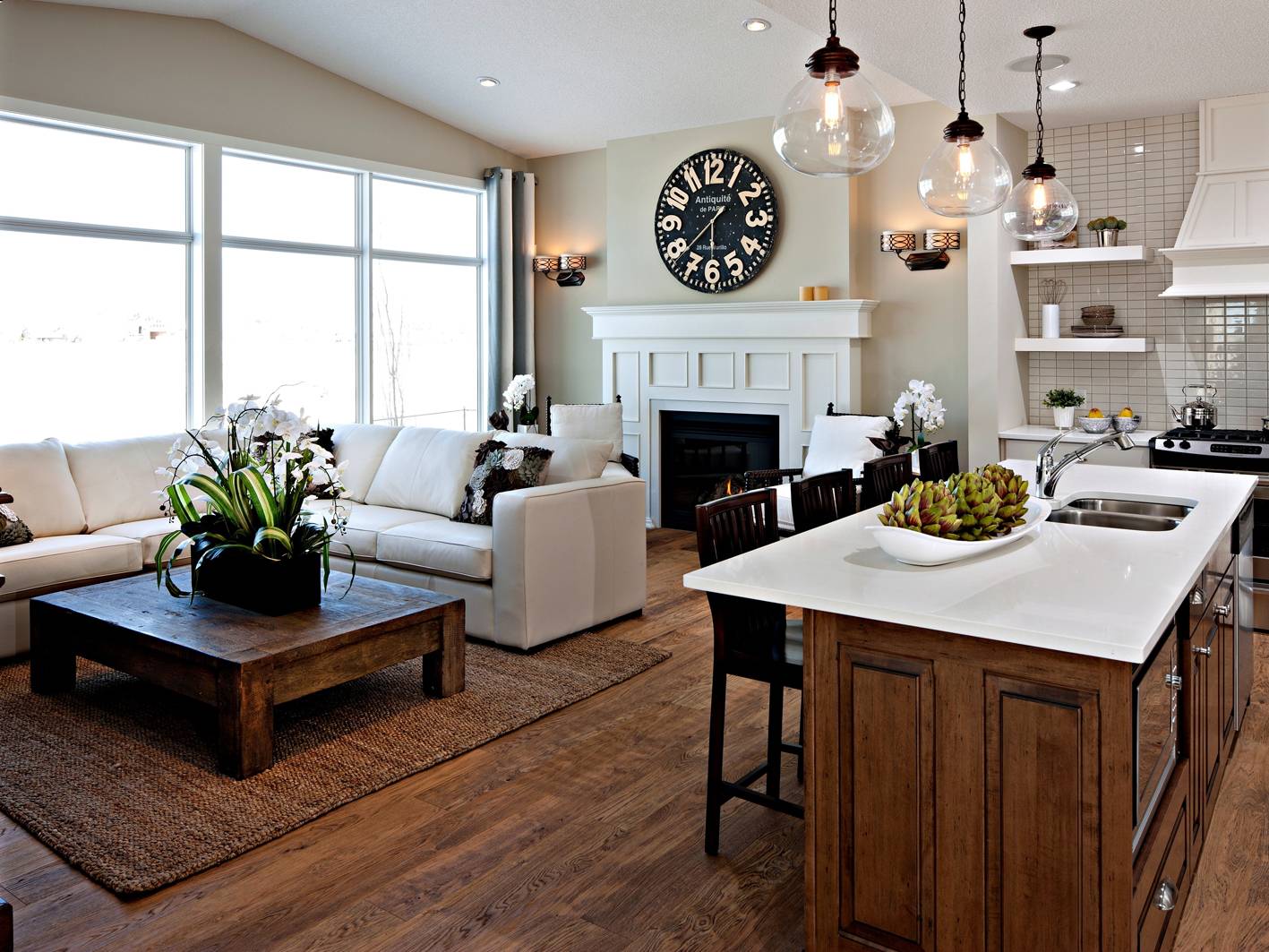 Совмещённый интерьер комнаты — не редкость в наши дни. Изначально причиной к возникновению подобных дизайнерских решений послужила нехватка пространства в городских малогабаритных квартирах. В частных же домах довольно длительное время отказывались от экспериментов с совмещением считая, что шумы и запахи кухни не совместимы с уютной обстановкой в которую должен погружать нас интерьер гостиной. Однако на данный момент кухня, совмещённая с гостиной в частном доме – это не только удобно и стильно, но ещё и функционально и эргономично! Убедитесь сами: