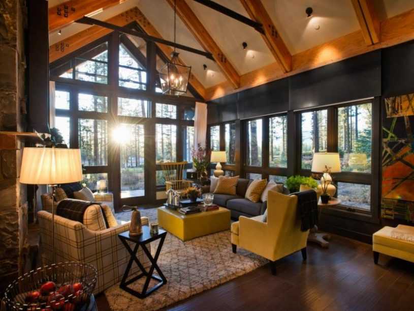 Понятно, что традиционный дизайн гостиной в частном доме приветствует деревянные окна, современный – пластиковые. Однако последние могут быть ламинированными, т.е. отделанными под лесной массив. Поэтому состав окон можно замаскировать. Другое дело – размеры.