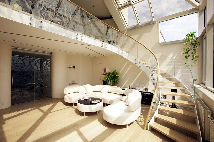 При помощи лестницы правильного вида и формы можно визуально приподнять потолок.