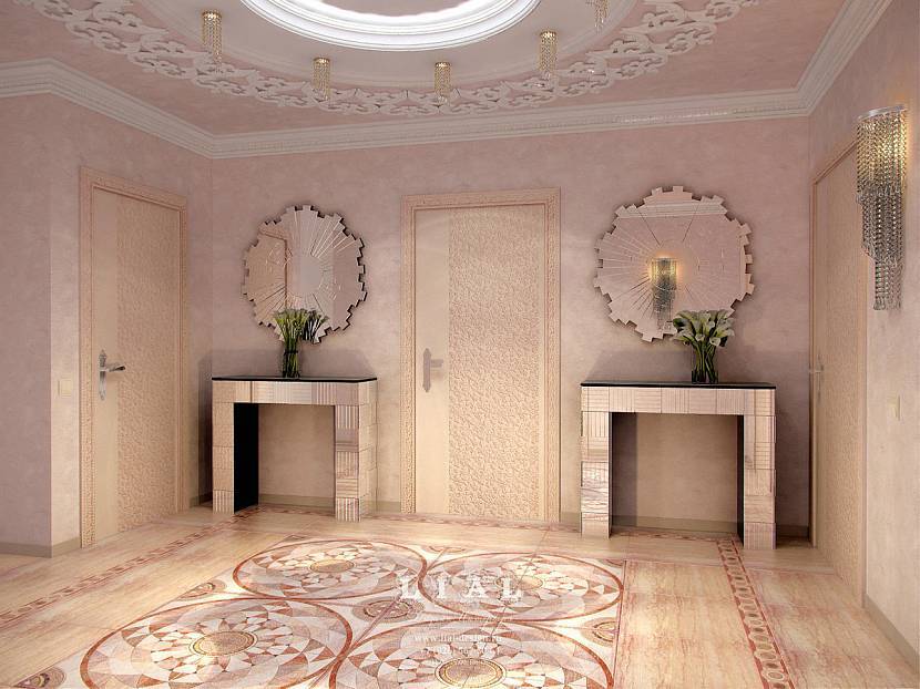 Если первая комната используется для приема, отделка холла должна быть парадной. Создать ее проще всего при помощи декоративной штукатурки и дорогого художественного паркета. Он идеально подходит для просторных залов, оформленных в классическом стиле. Не менее впечатляющий мрамор и гранит. Такой материал часто выбирается для реализации изящного модерна.