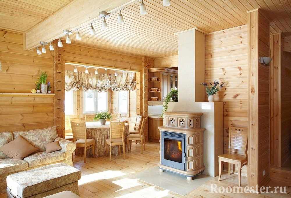 Все же для деревянного дома отлично подходит стиль шале, о котором рассказывалось выше. В деревянном помещении человек ощущает слияние с природой, не стоит отказываться от грубой мебели, шкур животных, натуральных материалов. В такое жилье органично вписывается камин.