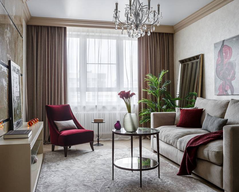 Интерьер маленькой гостиной невозможно представить без занавесок с декоративными подвязками.