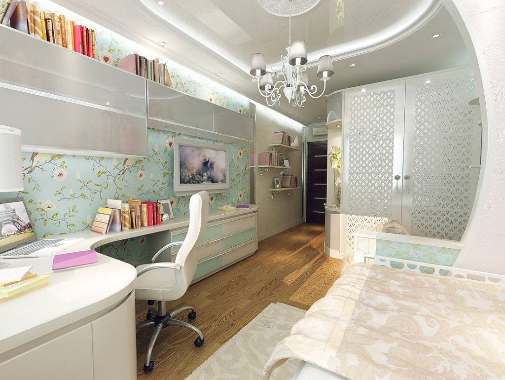 Для того, что бы соответствовать требованиям вашей дочери, дизайн комнаты для девушки (фото), должен представлять из себя синтез спальни, кабинета, библиотеки, и гостиной. При этом стоит помнить о том, что с возрастом, роль таких зон как кабинет, библиотека и гостиная, серьезно возрастает. На протяжении всего взросления дочери, от родителей требуется правильно организовать все зоны комнаты. При работе за столом девушка не должна уставать, портить зрение, в результате плохой освещенности, и иметь свободный доступ к нужным книгам, или другим предметам.