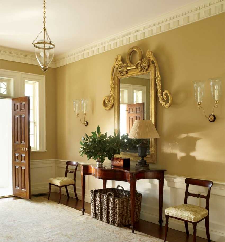 Классическую прихожую оформляют в светлых тонах: беж, пастельные оттенки, сочетания серо-белых цветов. На пол выстилают мягкие коврики. Зеркала оправляют в рамы овальной формы. Обои пастельных оттенков имеют нежные узоры со множеством завитушек. Картины, с изображениями сценок из средних веков только приветствуются. Мебель из натурального дерева светлых оттенков на изящных, витых ножках. Обязательно наличие плафонов или люстры сложной формы с мягкими изгибами. Приветствуется использование позолоты. В качестве элементов декора применяют раритетные вещи «с историей» или их имитацию. Потолок украшается аккуратной лепниной. Одним из компромиссных вариантов для приверженцев классики, которые все же готовы внести в нее элементы современного стиля, подойдет неоклассика. Это направление допускает небольшие модные «вольности» в оформлении.