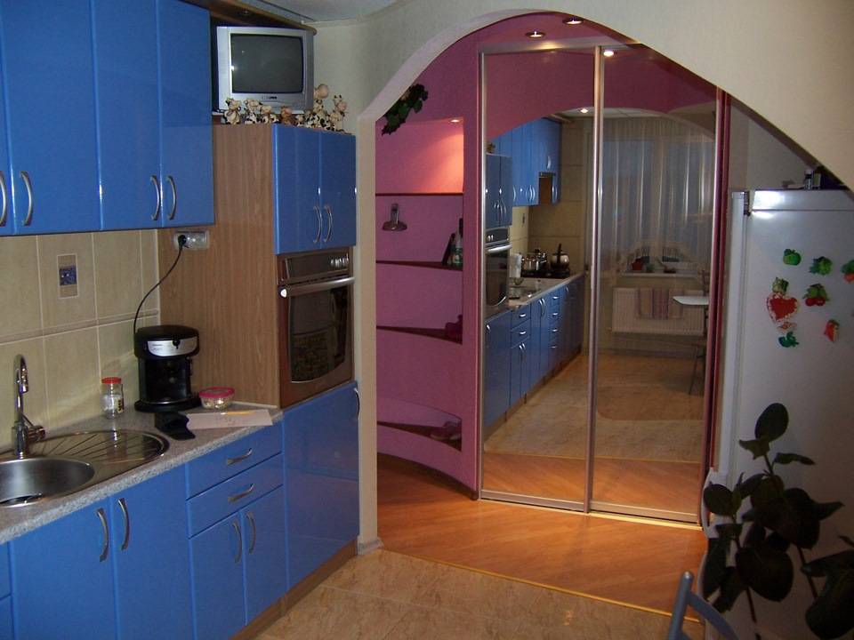 В коридоре( но о нём позже) появился шкаф-купе, прямо напротив кухни, а в районе бывшей перегородки сделал арку змееобразную. Вроде и есть отделение одного пространства от другого и вроде ходить не мешает.