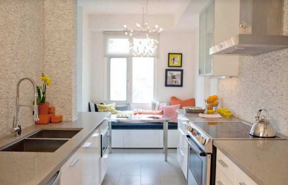 Для широких помещений, в которых расстояние между установленными по разные стороны предметами гарнитура будет больше 1,2-1,3 м, подойдет установка мебели в два ряда. Иногда приходится часть бытовой техники выносить на балкон, если это возможно, или использовать подоконник.