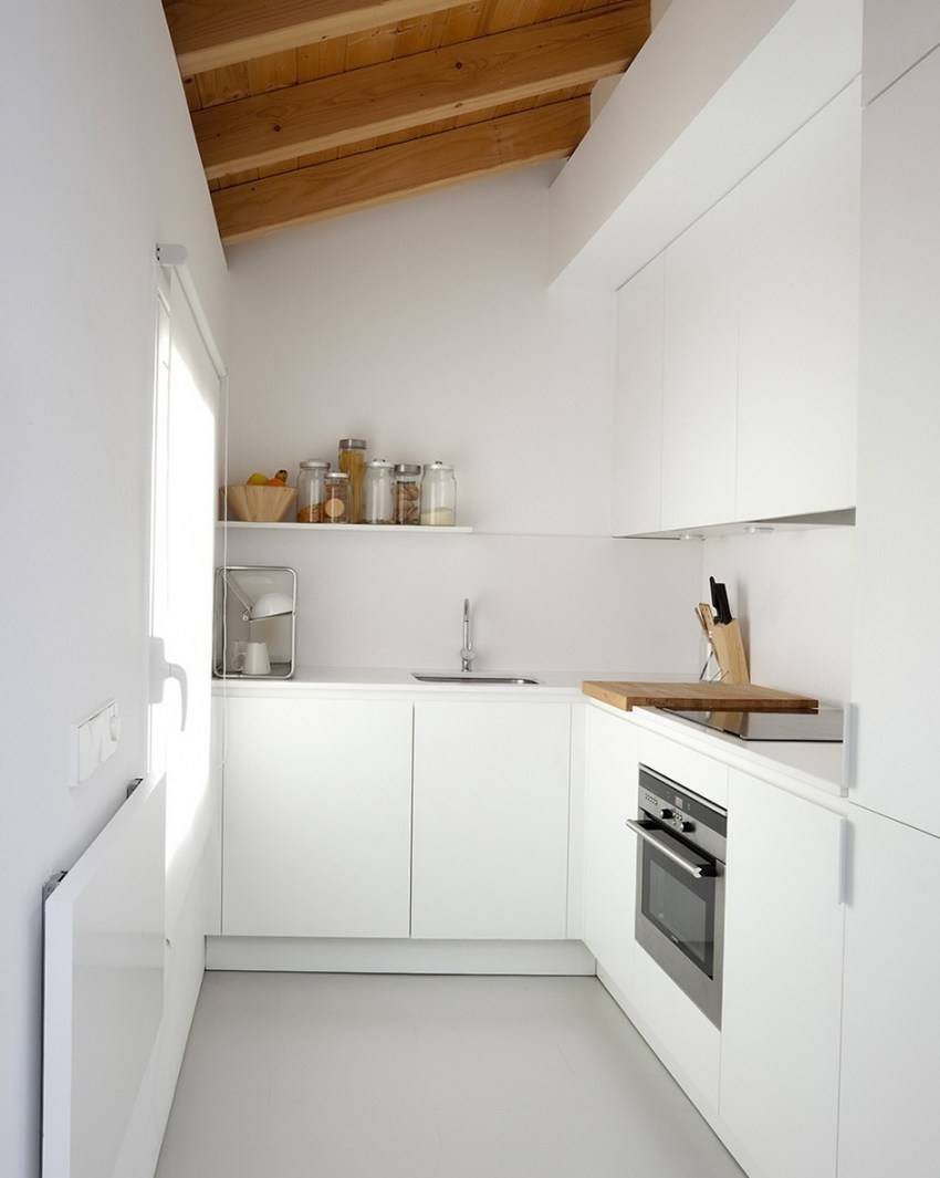 Цветовое оформление – обязательно светлое, с обилием белого и применением глянцевых поверхностей. Так ты деликатно скроешь шероховатости планировки и ограниченный метраж кухни.