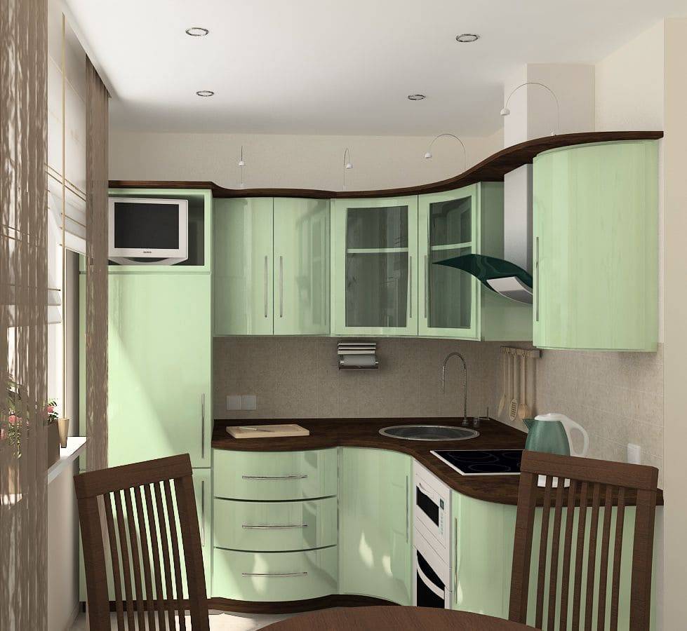 Хорошим вариантом для небольшой кухни может стать «г»-образная планировка этого помещения. Все шкафы на такой кухне размещаются вдоль двух смежных стен, что дает достаточное пространство для систем хранения и размещения техники, а возле третьей стены можно расположить стол со стульями.