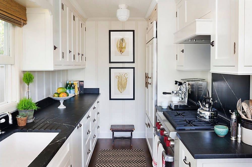 - в условиях маленькой кухни не придется преодолевать большое расстояние, чтобы дойти от одной рабочей зоны до другой, например, отнести кастрюлю к раковине, чтобы слить воду после варки макарон);