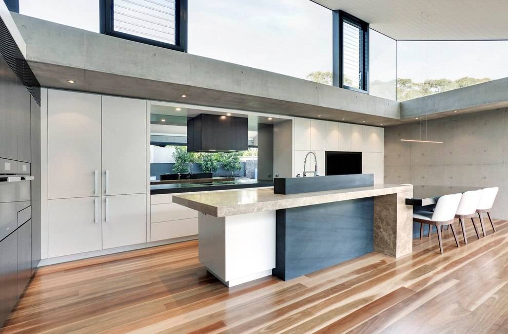 Что касается выбора материалов и поверхностей покрытия для кухни в современных домах, то все чаще используются натуральную и органическую отделку. Вы можете увидеть это не только в напольных и настенных покрытиях, но и на кухонных столешницах. Настенные покрытия, облицовка стен и деревянные столешницы остаются очень модными в современном кухонном декоре. Еще один очень популярный материал — камень. Он имеется в различных формах, наиболее интересным из которых является мрамор. Нержавеющая сталь в течение многих лет доминирует на кухнях оставаясь популярным решением для некоторых деталей, таких как, например, вытяжки.