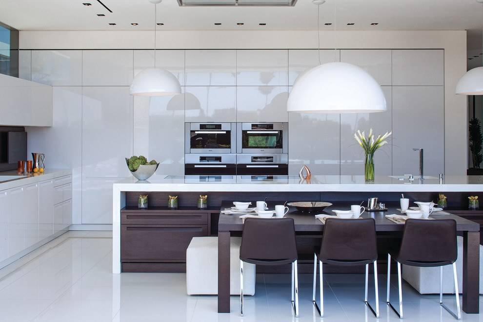 Модерн. Стиль для тех, кому нравятся роскошные интерьеры экстра-класса. Для создания в кухне-столовой нужной обстановки понадобится изысканная мебель и дорогие отделочные материалы.