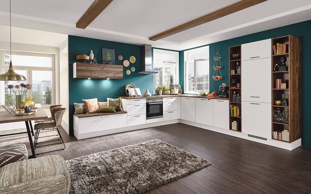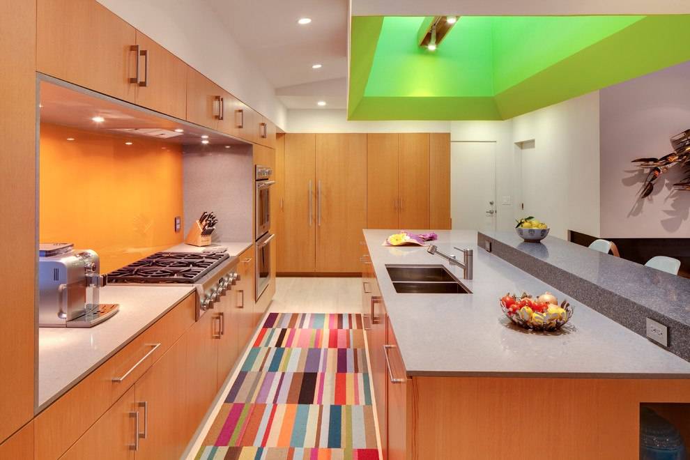 Именно поэтому дизайнеры рекомендуют сочетать не более трех ярких оттенков. Очень выгодно в плане зонирования работает окрашивание кухонной и гостиной зон в разные цвета. Ковровая дорожка, разные рисунки или цвета будут зрительно увеличивать помещение и одновременно разделять кухню и зону отдыха. Именно это является конечной целью ремонта.