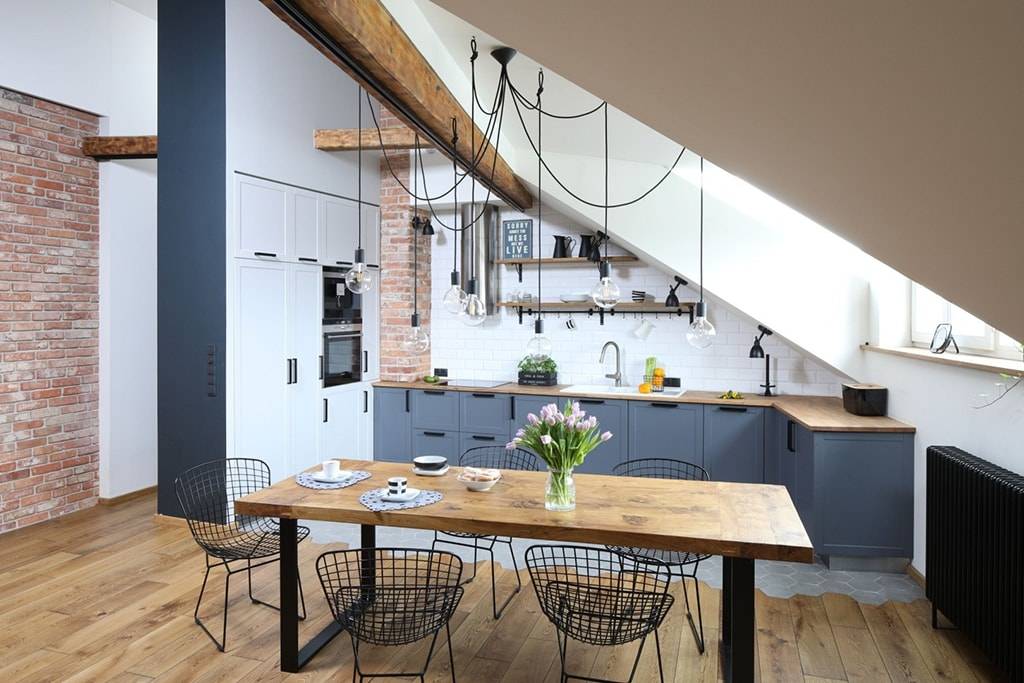 - Подпоры и потолочные балки. Смотрятся естественно, самобытно, немного грубовато, но уютно. Они гармонично впишутся в стили прованс, кантри, лофт. Интерьер гостиной, совмещённой с кухней, в стиле лофт в частном доме можно увидеть ниже.