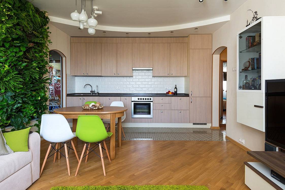 При совмещении комнат хозяин сам выбирает эффект: четкое разделение зон или плавное перетекание кухни в гостиную.